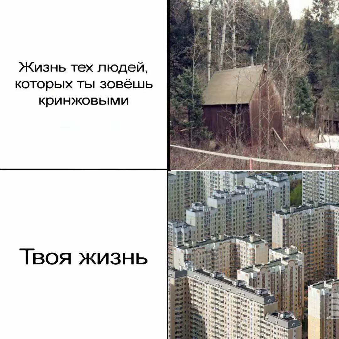 На изображении представлен мем из четырех частей. В верхнем левом углу надпись "Жизнь тех людей, которых ты зовёшь кринжовыми", а рядом с ней — фото ветхого деревянного домика в лесной глуши, окруженного деревьями и кустарниками. В нижнем левом углу надпись "Твоя жизнь", а справа — изображение большого жилого комплекса с множеством одинаковых многоэтажных домов, плотно застроенных в городском пейзаже. Этот мем используется для сравнения жизни "кринжовых" людей, которые, возможно, живут простой и непритязательной жизнью, с "твоей жизнью", представляющей собой монотонное существование в современном, застроенном мире.