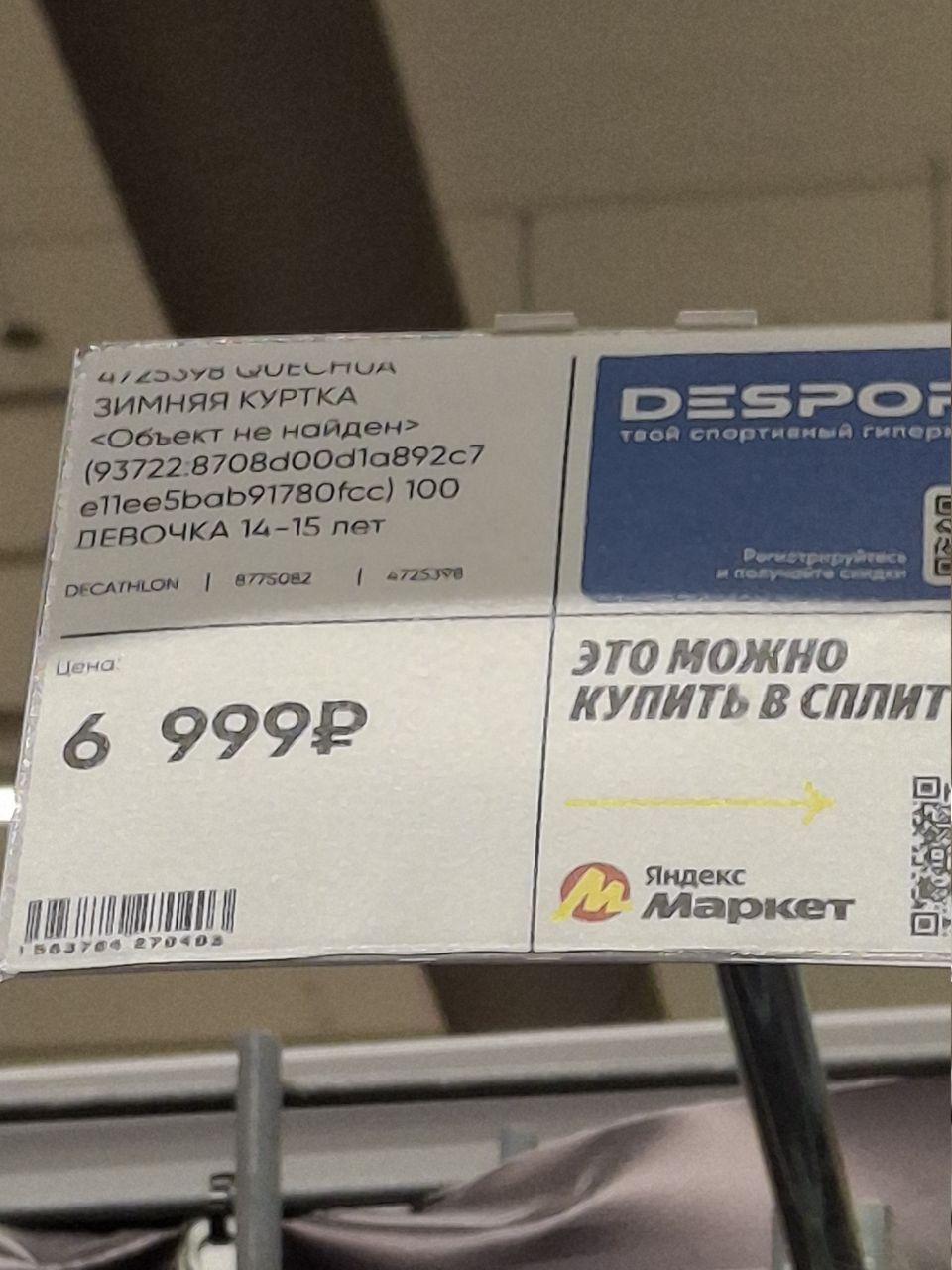 На изображении представлен ценник из магазина, вероятно, Decathlon или Desport, где продается зимняя куртка. Самая примечательная часть ценника – это описание товара: вместо обычного названия указано «Объект не найден» с каким-то системным идентификатором в скобках. Далее указано, что это куртка для девочки 14-15 лет. Рядом с информацией о товаре виднеется цена в 6 999 рублей. Правая часть ценника содержит информацию о том, что покупку можно оформить в сплит через Яндекс Маркет, что подчеркивает современные возможности оплаты.